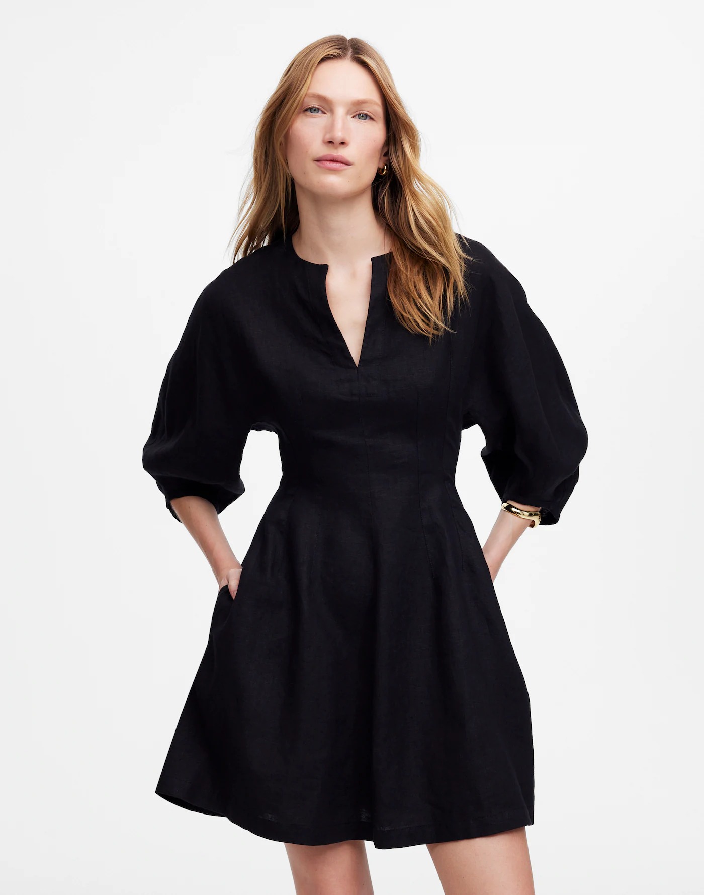 Crafted from 100% linen, this mini dress features a split